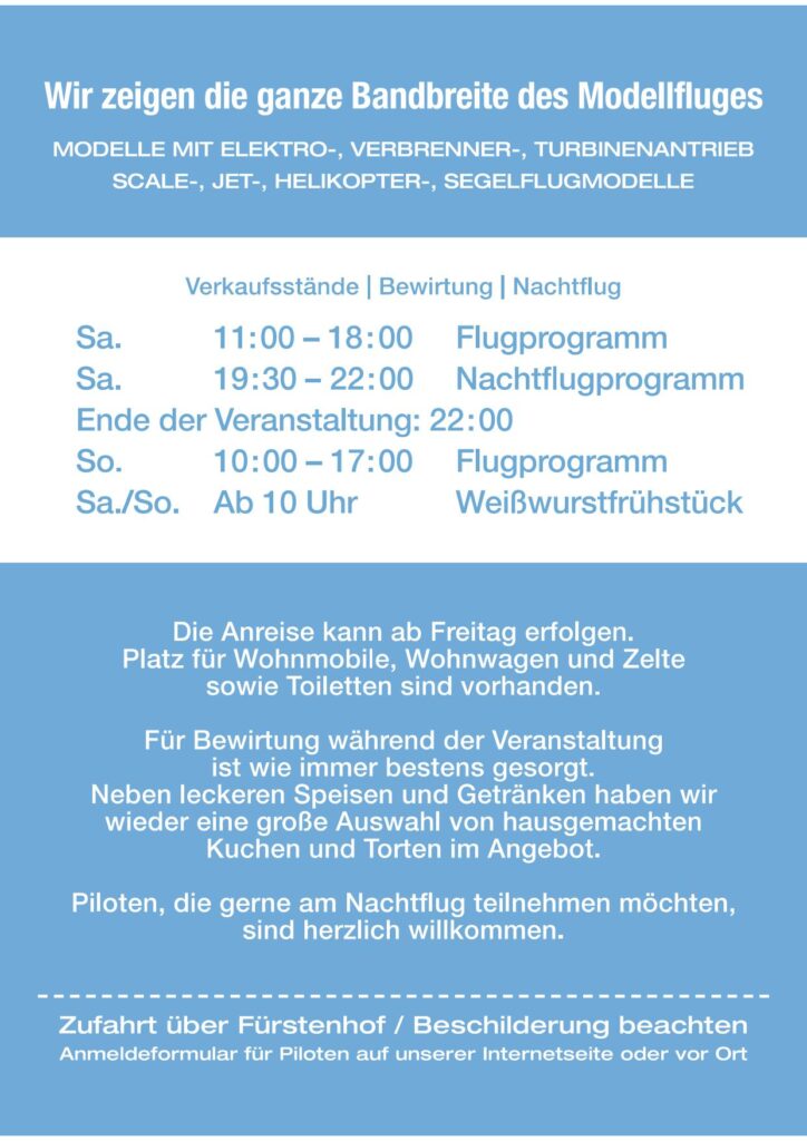 Es werden alle Arten des Modellflugs vorgeführt. Von Jets, Motorkunstflug, Modellhubschrauber, Segelflugmodelle, F- Schlepp und vieles mehr wird vertreten sein.