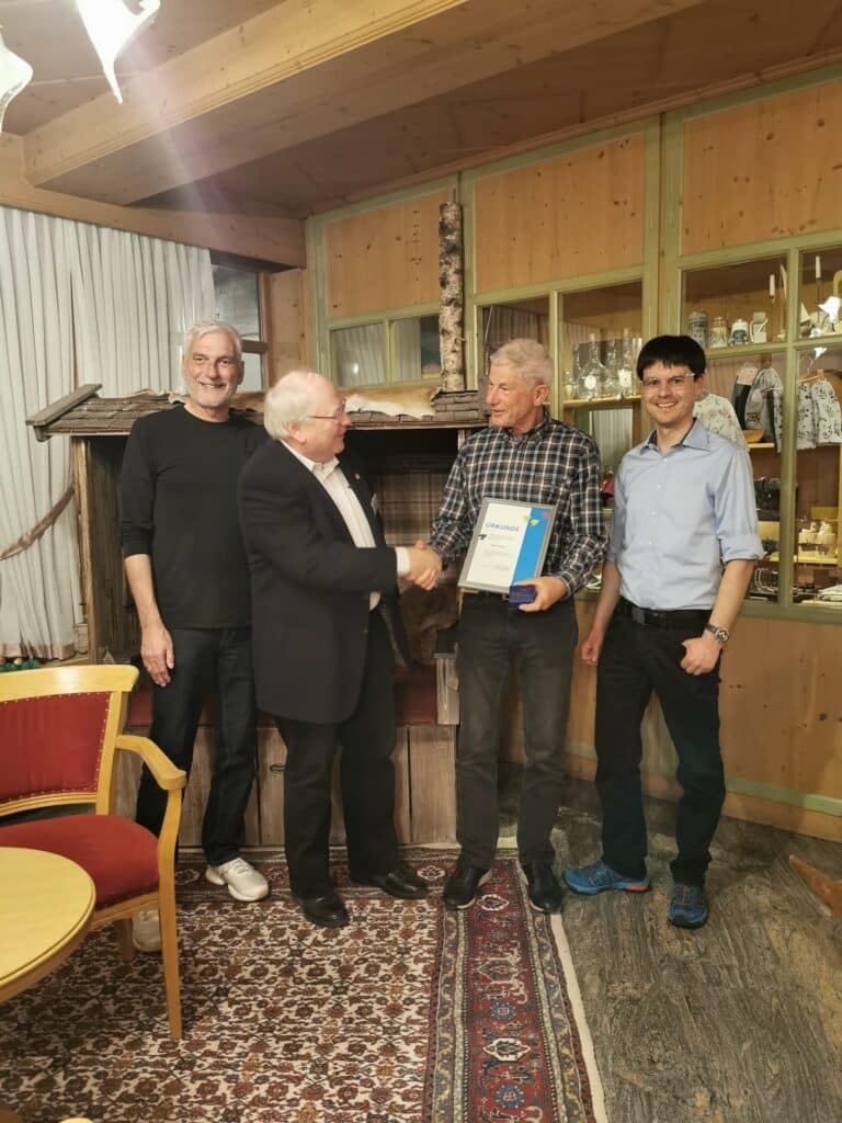 Im Rahmen der Jahreshauptversammlung der MFG Achental e.V. ist ihr Kassierer für seine Tätigkeit, die er seit 25 Jahren ausfüllt, mit der Vereinsehrennadel des DMFV ausgezeichntet worden. In den Ablauf der Jahreshauptversammmlung wurde eine kleine Zeremonie eingebunden, in der die Ehrung, durch den Gebietsbeauftragten des DMFV erfolgte. Peter Minwegen, der hier die Vereinsehrennadel überreicht bekam, war von der Ansprache des Gebietsbeauftragen Markus Eiglsperger sichtlich gerührt. Er freute sich sehr, dass ihm der Verein für seinen nicht unerheblichen Beitrag zur gesunden Finanzsituation des Vereins diese Ehrung zukommen lies. Der Gebietsbeauftrage brachte deutlich zum Ausdruck, dass es ihm immer wieder eine besondere Freude ist, Vereinsmitglieder auf Vorschlag ihres Heimatvereins in Würdigung ihrer Leistungen für den Modellflugsport im Rahmen der Vereinsarbeit zu Ehren.
